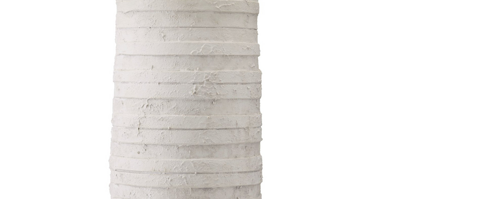 Flat discs of terracotta in a white finish means this lamp has a heavy dose of texture. The natural linen shade is held in place with a matching terracotta finial.