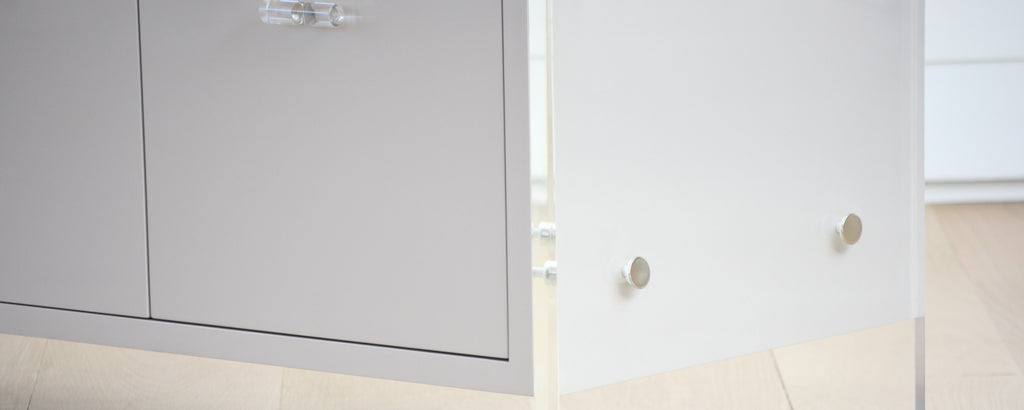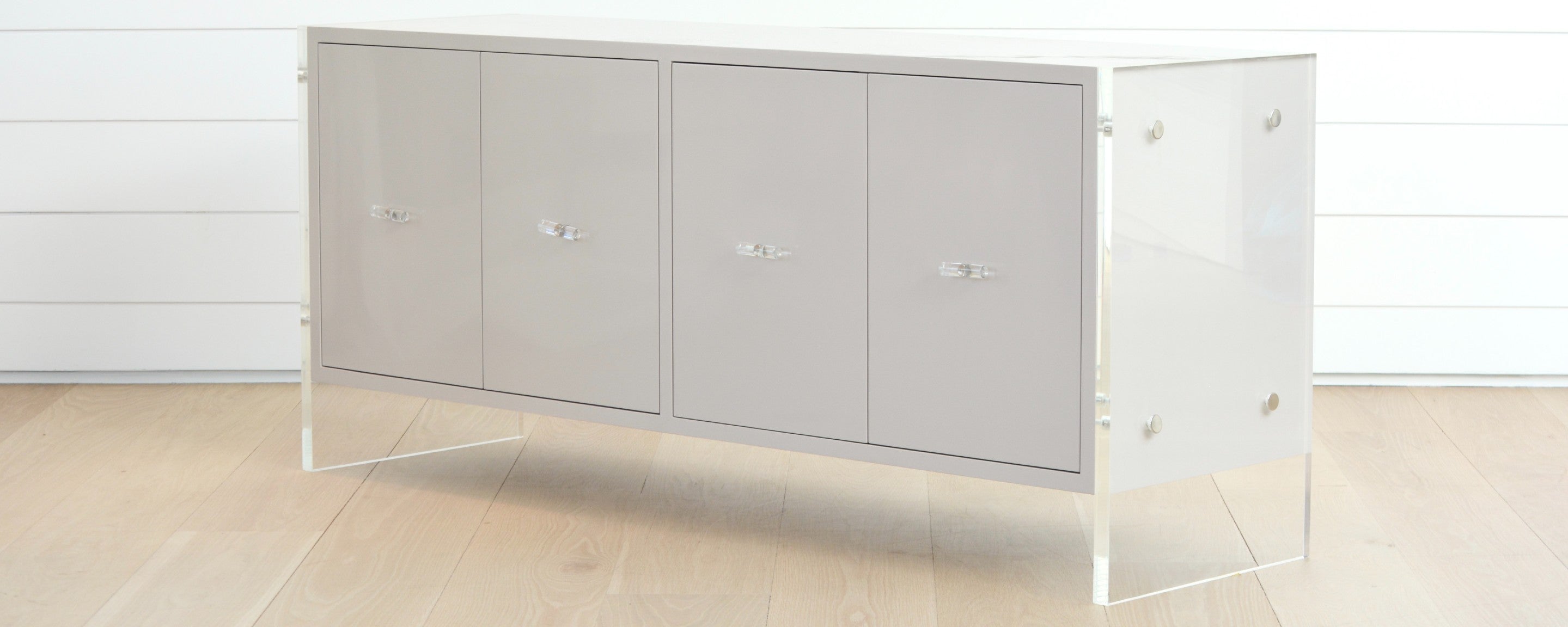 White lacquered buffet cabinet with 1" thick diamond-polished lucite end panels that have polished chrome nickel endcaps. Behind each flush-mounted door are two adjustable shelves. Made by hand in the USA. Homenature exclusive.
