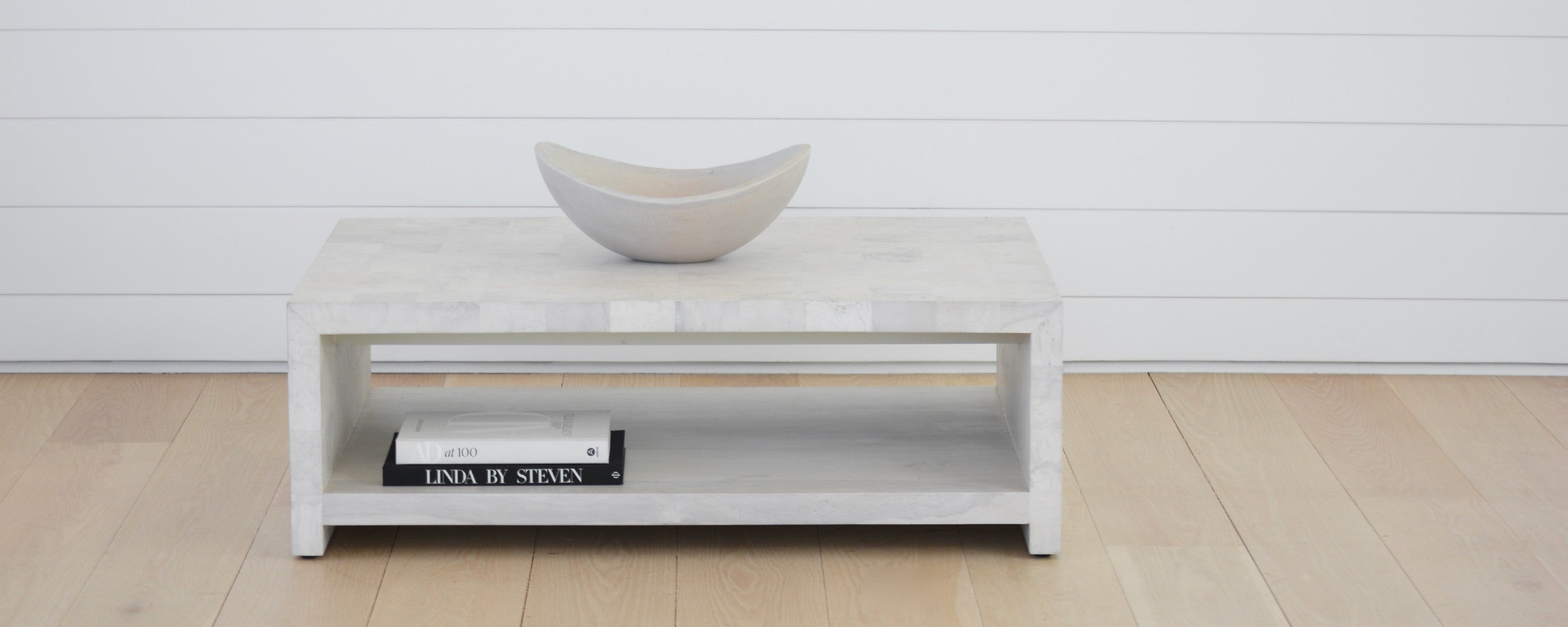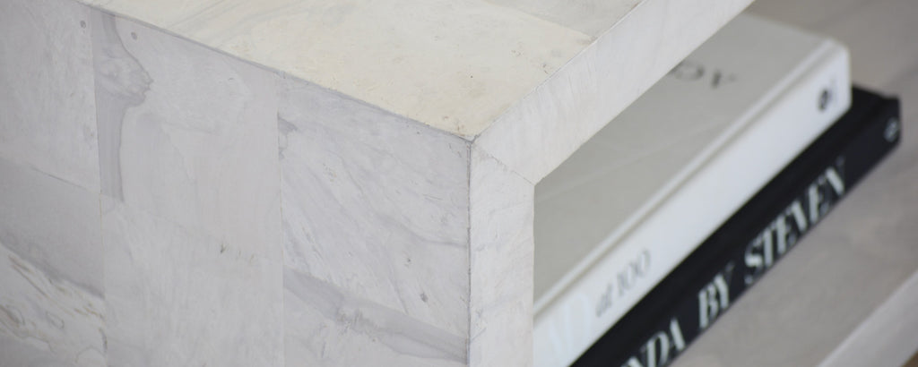 Aged tropical oak is bleached then hand cut and carefully laid in a patchwork pattern, highlighting the subtle tones and details of this unique and rare material. The single shelf is finished in bleached olive. Please note variation is to be expected. We believe this only adds to the beauty of each individual piece.