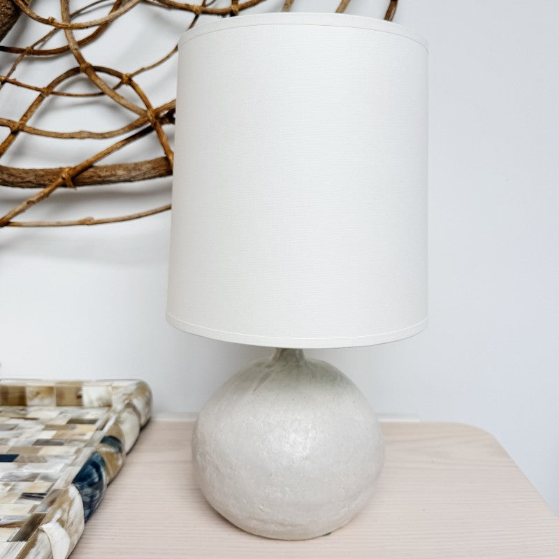 Due to the handmade nature of the lamps, size and shape can vary. As a result of the artist's process we can not take special orders on these lamps, and can only sell from existing inventory. Please be aware our lamp pairs have a drum style shade as seen in the second image.