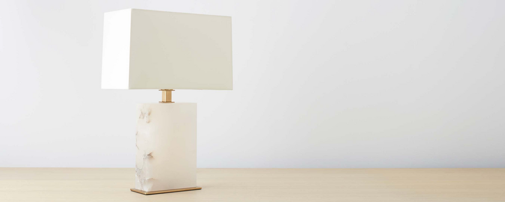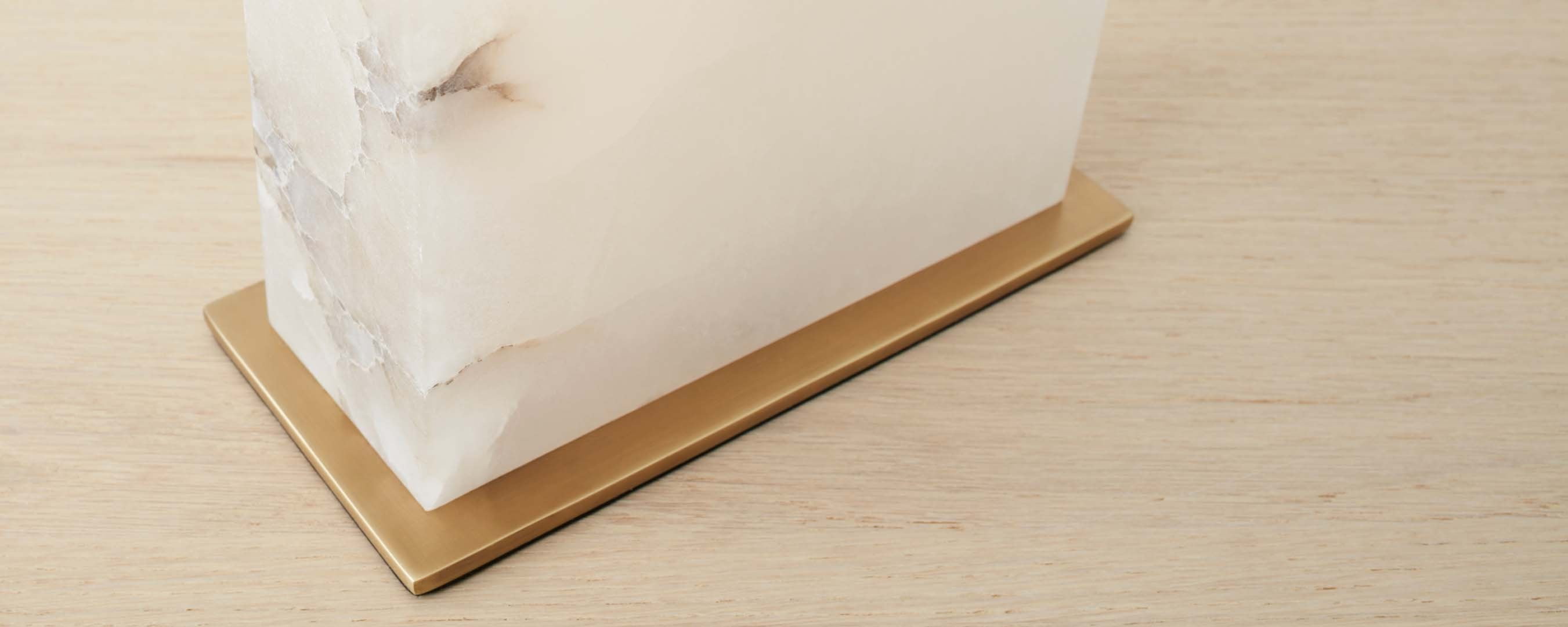 Solid alabaster marble cut into rectangular slabs and sits on a thin rectangular base. Topped by a white fabric shade with cotton lining, and a vintage brass finial. Variation in color and texture is part of the natural beauty of this lamp.
