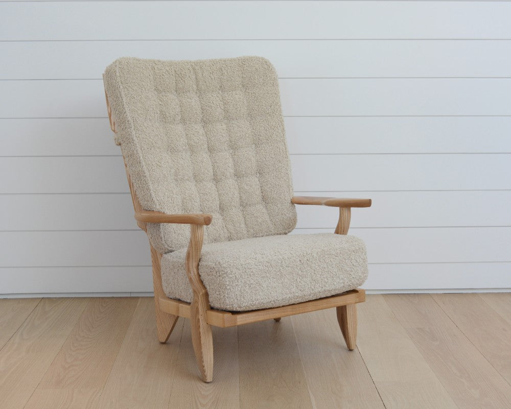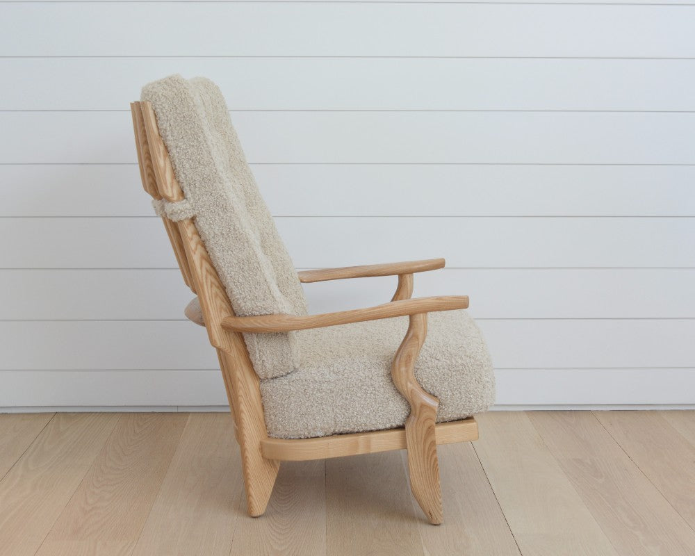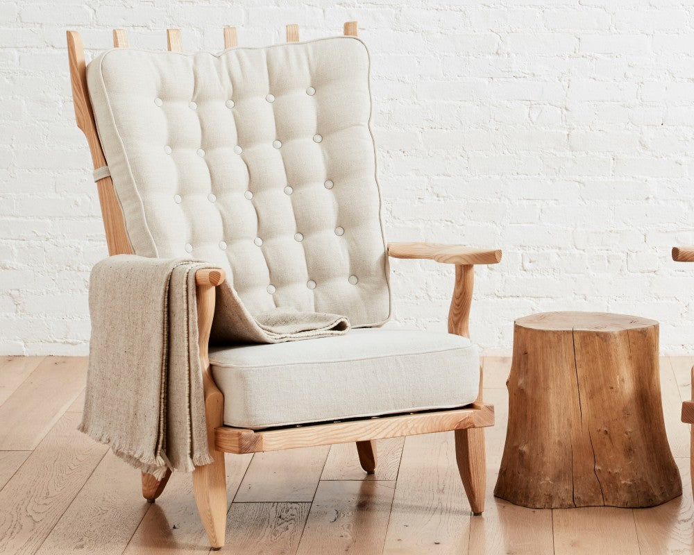 A mid-century French design inspired the high-back slatted Ash frame and button tufted cushions of our Big Sur lounge chair. We stock it with cushions in a light-colored cotton, but you can choose to have them made from one of the dozens of fabrics we offer, or one that you supply. Cushions available in all our fabrics as well as in COM. Now also available in llama boucle fabric. Hand crafted in North Carolina using local, sustainable hardwoods and eco-friendly materials.  Price is based on standard fabric.