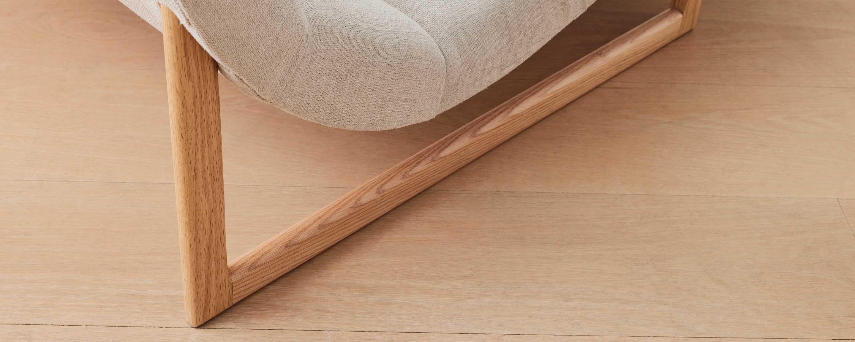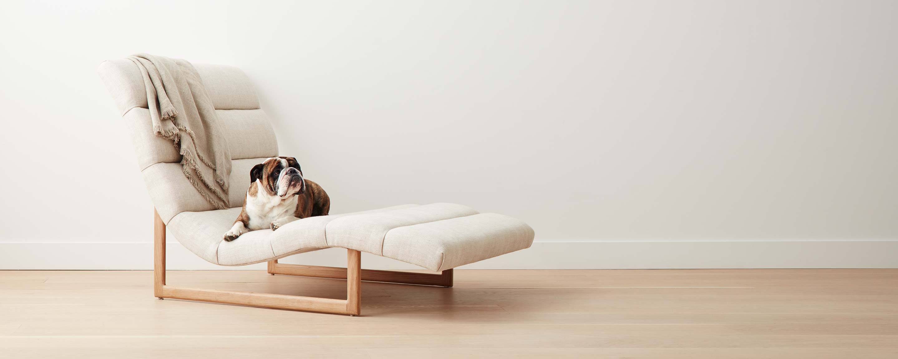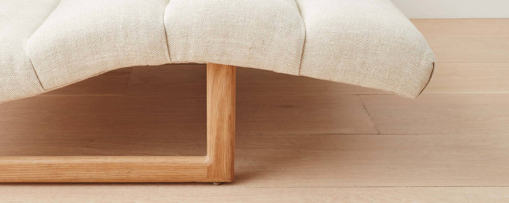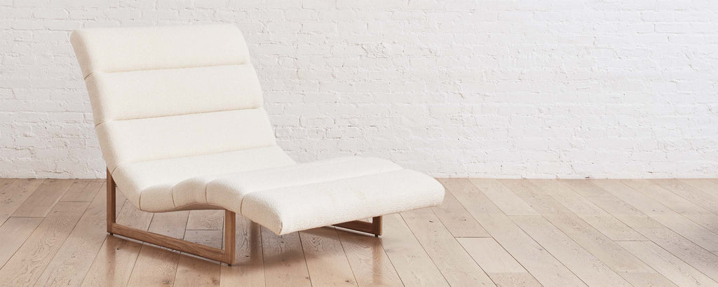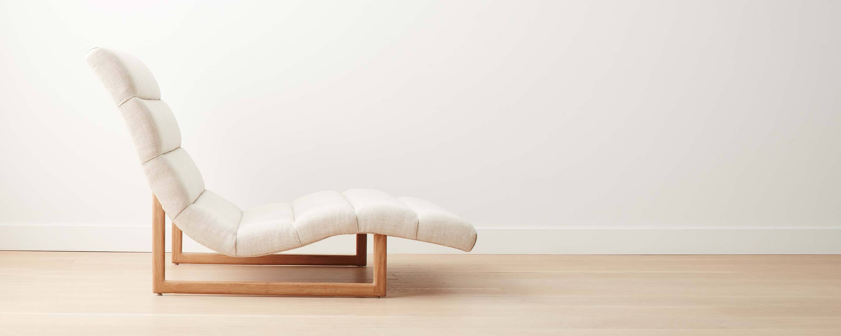 Our take on a vintage modern Danish chaise, with a comfortable, fixed-position, upholstered seat that mimics the curve of the body, and a minimal, elegant, wood base. The fabrics and wood stains of this chaise can be customized.