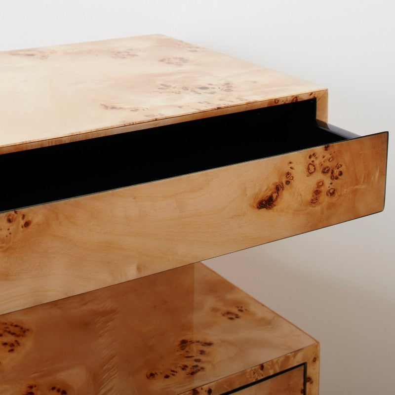 Three-drawer end table with a solid wood base and rare Mappa Burl inlay. The lacquer layers are poured and sanded by hand.