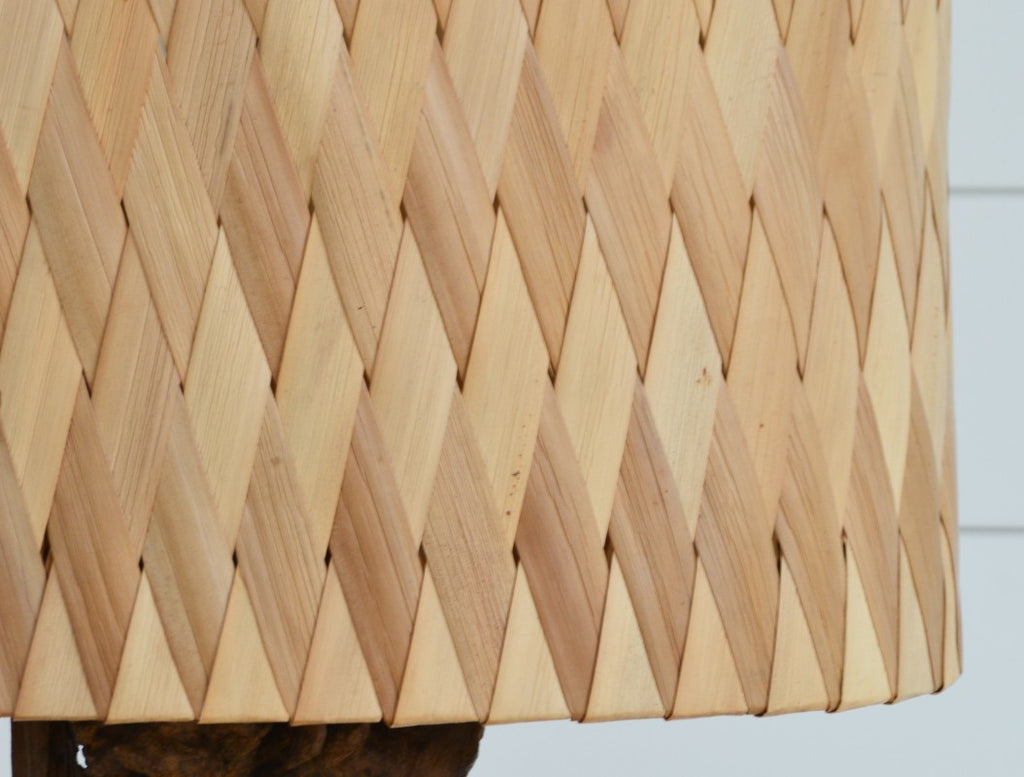 Vintage driftwood floor lamp with a basketweave shade.